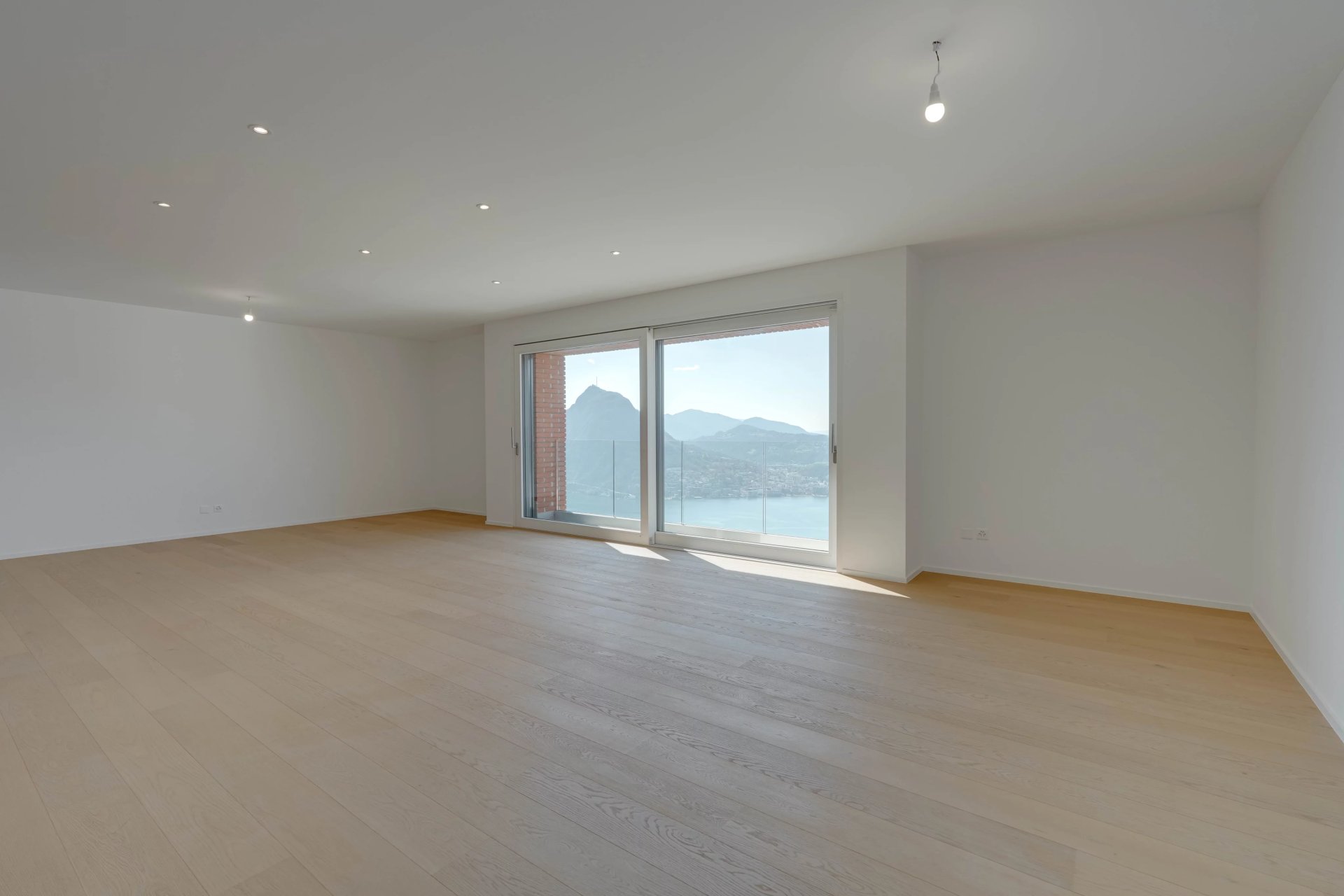The villa offers 270 m² of living space, 98 m² of terrace space, 4 bedrooms, and 2 bathrooms. The light-filled living area opens onto a well-kept garden and a spacious roof terrace – both with spectacular 180° views over the Gulf of Lugano and Monte San Salvatore. High-quality materials, modern building services, and a well-thought-out room concept ensure an exclusive living experience. Two garage spaces complete the offer.